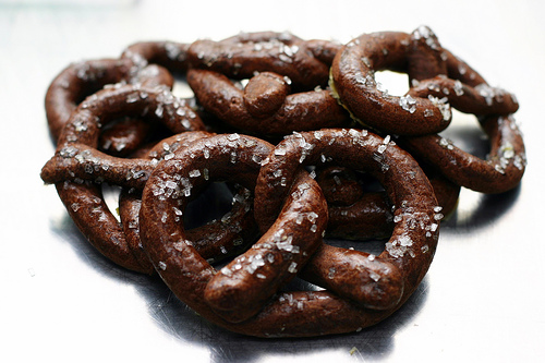 I see pretzel cookies all of the time, but they’re usually just cut from pretzel-shaped cookie cutter, and not actually twisty and knotted, which I consider totally unacceptable. It’s like one of those things I saw Sandra Lee use the other day which cut her pie lid into the shape of a lattice, without actually weaving it. Meh, I say. That would totally ruin half my fun.