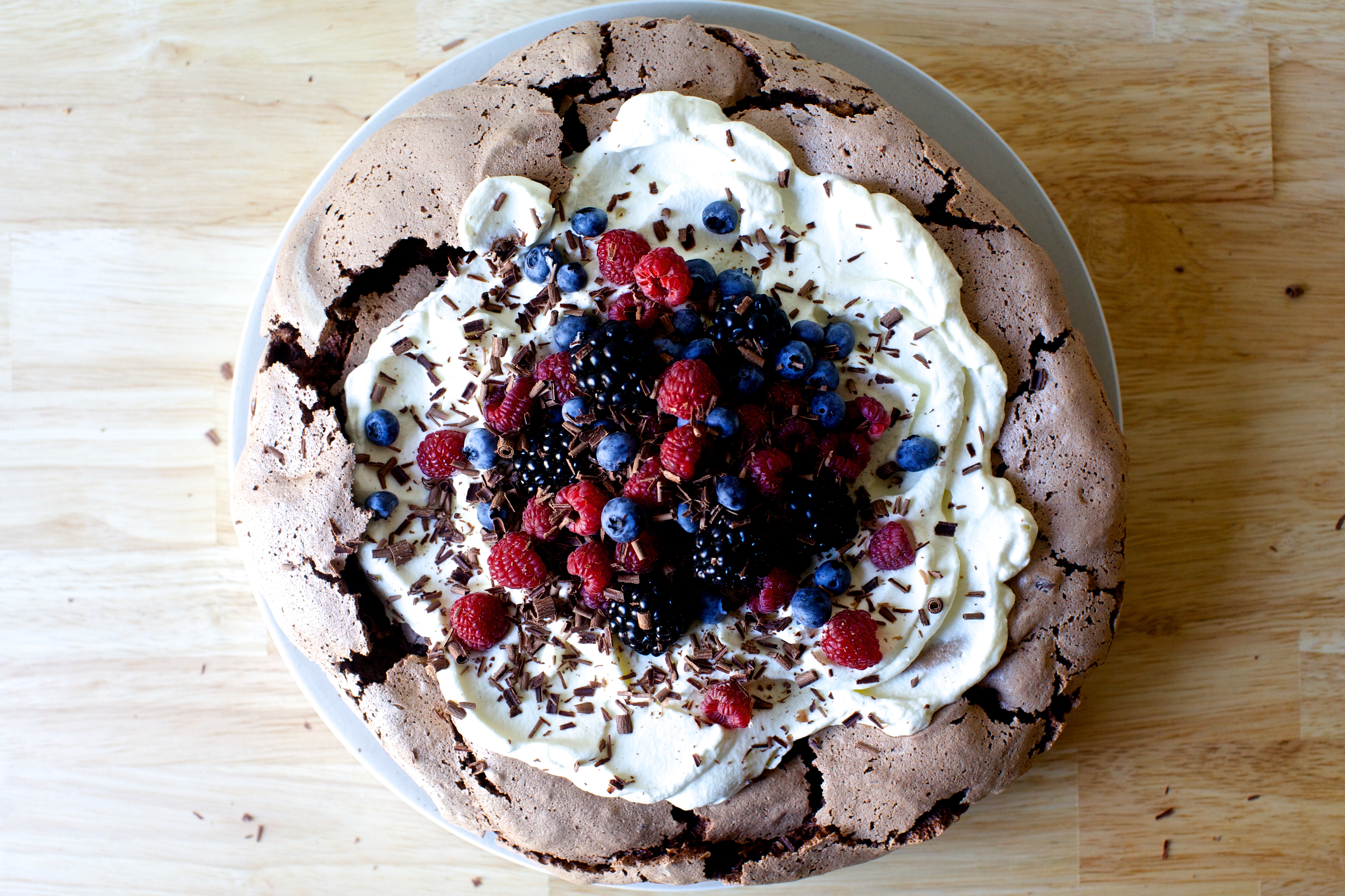 Look, no one is ever going to marry me for my pavlova. (I mean, talking about dodging a bullet…) This one was particularly underachieving. First, I thought I’d be clever and try to add the cocoa at the start, mixed with the sugar, so that it would mix the best. Nope! It never fully whipped. With this in the trash, I began my next one, breaking an egg yolk right into the white. I can usually get it all out (tip! use the empty shell as a scooper/skimmer) but not this time. I started a new bowl and, yup, did it again. Finally, with six uncompromised egg whites and cocoa stirred in only at the very end, ensuring a respectably thick, shiny plume of meringue, I began piling my chocolate plumes on a 9-inch round parchment circle, only to realize this wasn’t very bright, as the meringue would spread. I cut a new, larger square of parchment and used the old one as a sling/tube-of-a-pastry bag to land the new one in a great, elegant swirl and then fell over laughing (and texting everyone I know with the picture because: all grownup here!) because it looked precisely like everyone’s favorite emoji. Smoothed into more of a mound, I baked it at the wrong temperature and it got too crispy and riddled with cracks. Anyone left reading from New Zealand just is doing this right now. (Don’t worry, I retested it — woe is me — to confirm that the correct temperature and times are indeed correct.)